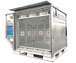 本製品は日本航空株式会社と共同開発した定温コンテナで、蓄熱剤を活用することで外部電力を必要とせず、環境負荷を抑えながら優れた経済性を実現しています。航空機装備品や輸送用コンテナで培った技術を基に設計され、医薬品・生鮮品など温度管理が必須の貨物を長時間一定温度で輸送できます。高品質な定温物流を支える特殊コンテナとして、現在特許審査中です。